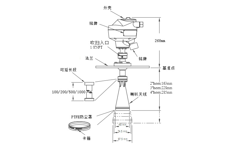 UVRH-32采用喇叭式天線的25GHz高頻脈沖雷達物位計,專用于固體料位的測量,量程達30m。產品采用獨特的瞄準器(萬向節)設計,可根據現場工況調節天線的發射角度,有效提高了傾斜固料測量的可靠性。產品適用于高粉塵和高溫物料的應用場合。